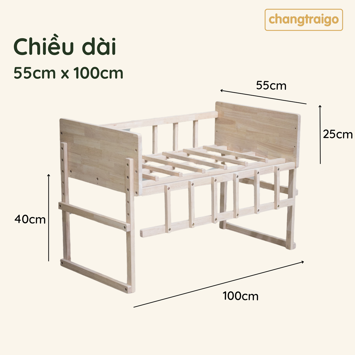 Kích thước lọt lòng nôi cũi : 50cm x 100cm